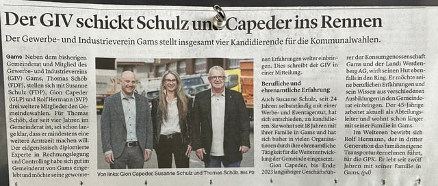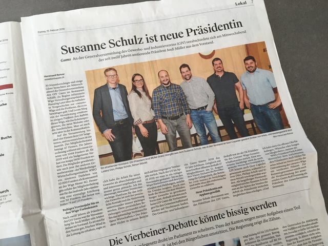 Susanne Schulz nutzte die Gelegenheit bei den Mitgliedern Werbung für den Gemeinschaftsstand des Gamser Gewerbes an der WIGA im September zu machen. Sie motivierte die Mitglieder auf dem Stand Präsenz zu zeigen. Sei es als Aussteller mit einer Fläche, auf dem Bildungsstand «Dini Usbildig zGams» oder durch eine Werbefolie im Beizli. Es sollte das gemeinsame Gamser Gewerbe Ziel sein, zu zeigen was Gams zu bieten hat. Dies gelingt allerdings nur wenn jeder Betrieb bereit ist, egal welcher Art, die Angebote zu nutzen und mitzumachen. Es ist für jedes Budget ein Angebot verfügbar.